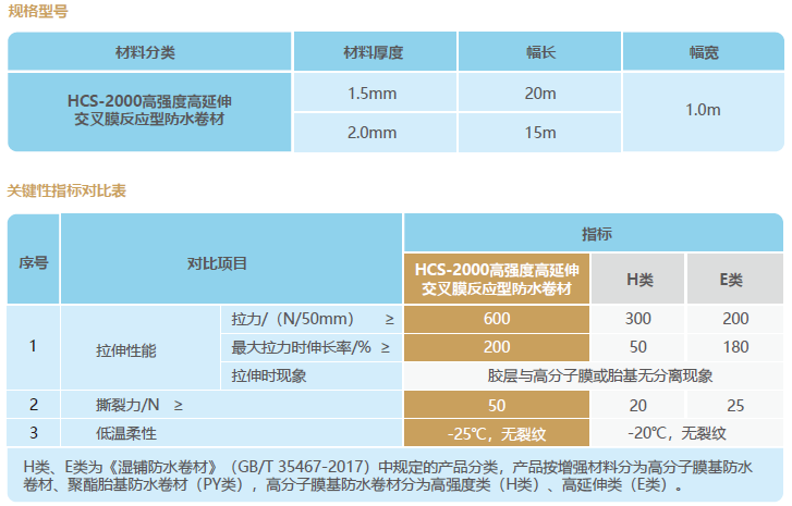 產品物理力學性能符合《HCS-2000高強度高延伸交叉膜反應型防水卷材》(Q/FSWJG0022-2018)標準,見下表: