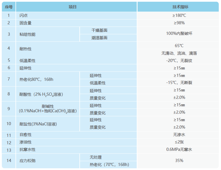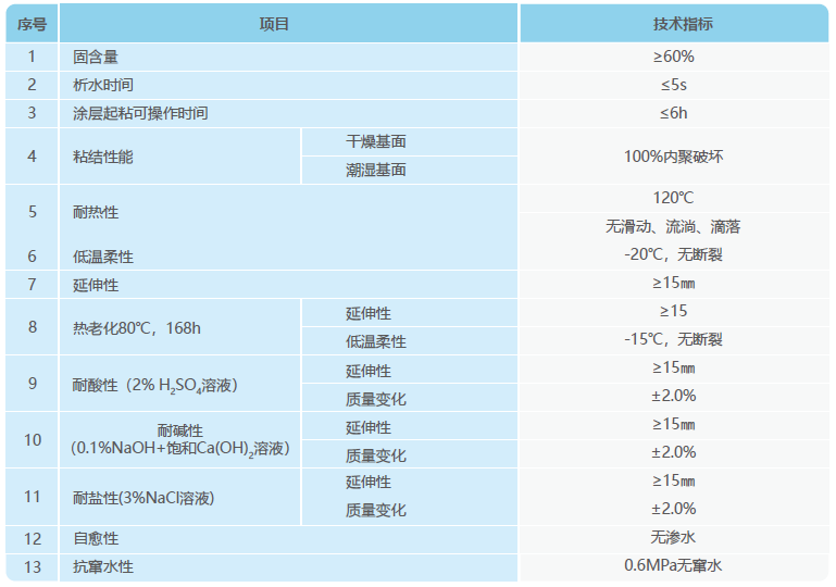 產(chǎn)品符合《水性非固化噴涂橡膠瀝青防水涂料》(Q/FSWJG 0019-2019)標(biāo)準(zhǔn),見(jiàn)下表: