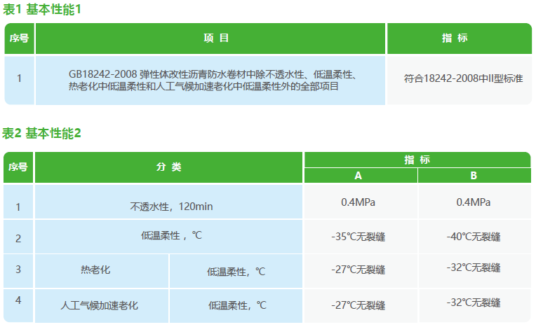 產品物理力學性能符合Q/FSWJG0021-2017《超低溫彈性體(SBS)改性瀝青防水卷材》標準要求,應符合表1和表2全部要求。